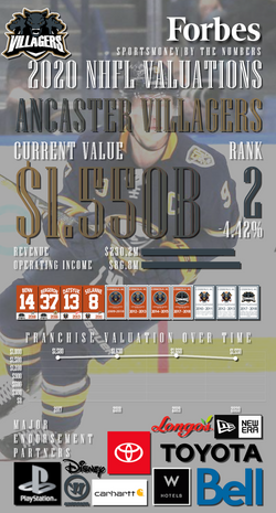 The Ancaster Villagers once again have the second-highest valuation, but their lead over the rest of the pack shrank in 2023. The Villagers rose 6% in value to $2.27 billion. The New England Sea Dogs rose nearly 14% in value, coming in just behind the total valuation of the Villagers at $2.26 billion.